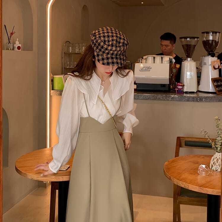 Setelan Temperamen Gaya Baru Blus Retro Prancis Wanita + Rok Suspender Temperamen Awal Musim Gugur Setelan Fashion Dua Potong