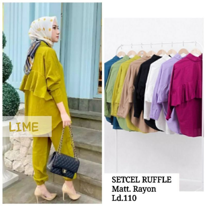 Setcel Ruffle Kemeja Fushia setcel joger Baju + Celana